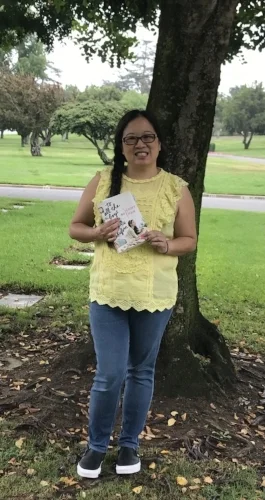 Dr. Bookworm holding her copy of Jenny Han's To All the Boys I've Loved Before. This is my message: things aren't always as they appear at first glance, just like people. If you're savvy, you know that I'm standing at a tree at a cemetery (where my grandparents and one of my daughters is buried), not at a park.